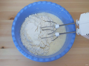 Всыпьте муку, разрыхлитель и перемешайте до однородного состояния. Тесто должно получиться средней густоты.
