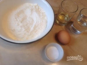Первым делом замешиваем тесто. Просеиваем в миску муку и добавляем смесь из воды, масла, яйца и соли. Тесто можно сделать и без яйца.