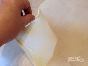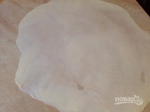 Смазываем стол растительным маслом и начинаем раскатывать тесто в тонкий пласт. На смазанном столе тесто раскатывается очень легко, так что необходимости вытягивать его у меня не было.