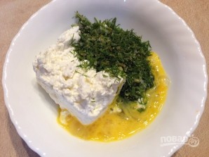 Пока тесто было в холодильнике, я приготовила начинку. Смешиваем творог, яйцо и измельченный укроп. Добавляем соль и перец по вкусу.