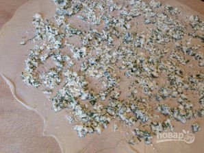 Раскатанный пласт смазываем растительным или сливочным маслом и выкладываем половину начинки. Распределяем ее.