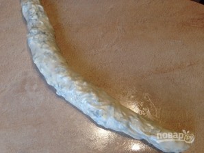 И начинаем сворачивать тесто с начинкой в рулет.