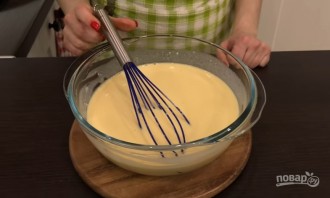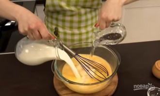 3. Возьмите молоко и воду комнатной температуры, влейте обе жидкости к яйцам, перемешайте.