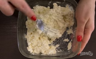 7. Пока налистники остывают, займитесь начинкой: в емкость выкладываете творог, разминаете его вилкой, добавляете немного сахара и сметану.