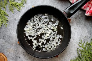 Репчатый лук и чеснок почистите и мелко порежьте. В сковороду налейте растительное масло, разогрейте на среднем огне и выложите овощи. Обжаривайте лук с чесноком на медленном огне в течение 7 минут. Лук и чеснок должны стать мягкими, но не обжариться.