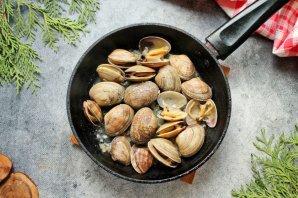 Добавьте в сковороду размороженные вонголе. Все перемешайте и готовьте на среднем огне три минуты.