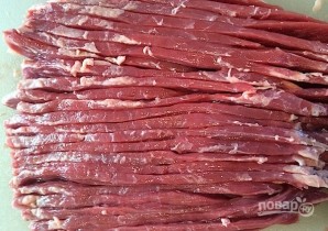 2. Острым ножом нарежьте мясо тонкими полосочками вдоль волокон (можно и поперек, но тогда готовое мясо может разваливаться немного).