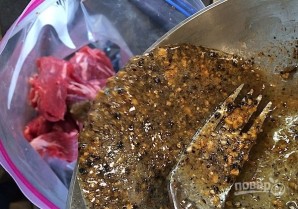 3. В небольшой мисочке приготовьте маринад - соедините пропущенный через пресс чеснок, соль, сахар и перец, мед, соевый соус и ароматные специи. Вылейте маринад в мясо, перемешайте аккуратно и уберите на сутки в холодильник.