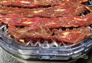 4. Разложите кусочки говядины на поддонах сушилки. Установите нужную температуру и сушите мясо до готовности, согласно инструкции (время будет зависеть от модели вашей сушилки).