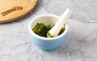 В ступке разомните сахар с цедрой лайма и листьями базилика.
