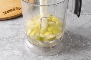 Яблоки помойте, удалите сердцевину и нарежьте кубиками среднего размера. Переложите в блендер, добавьте 200-300 мл. воды и измельчите до однородности.