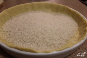 1. Первым делом рекомендую раскатать и выложить тесто в жаропрочную форму. Сверху можно высыпать крупу или горох, например. Отправьте тесто в разогретую до 180 градусов духовку минут на 10.