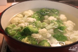 2. Брокколи вымойте, обсушите и разделите на соцветия. Отправьте в кипящую подсоленную воду и проварите 5 минут на среднем огне. В данном случае в рецепт приготовления закрытого пирога с брокколи и сыром добавлена еще и цветная капуста.