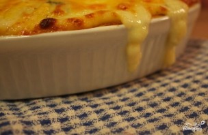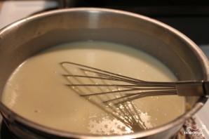 3. Верх пирога можно сделать из теста, но я рекомендую аппетитную заливку. Для ее приготовления в небольшом сотейнике растопите сливочное масло. Добавьте муку, обжарьте до золотистого цвета и влейте молоко. Посолите по вкусу, можно поперчить немного. Проварите до загустения.
