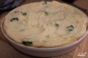 5. Выложите на тесто брокколи ровным слоем. Вылейте заливку и отправьте в духовку минут на 20.