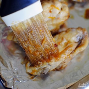 Когда верхняя сторона подрумянится - переворачиваем крылышки, смазываем апельсиновым соусом с верхней стороны и возвращаем в духовку еще на 3-4 минуты.