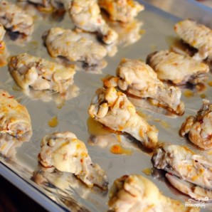 Выкладываем крылышки на противень, застланный фольгой или бумагой для выпечки. Ставим противень в предварительно разогретую до 190 градусов духовку и запекаем крылышки 3-4 минуты до появления корочки с верхней стороны.