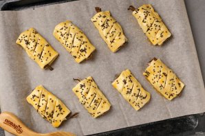 Переложите слойки на противень застеленный пергаментом. Я ещё дополнительно сделала на поверхности насечки ножом. Смажьте тесто желтком и посыпьте кунжутом. Выпекайте в разогретой до 200 градусов духовке около 15 минут.