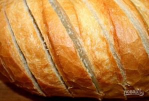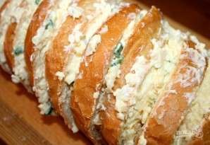 Батон нарезаем полосками, не прорезая до конца, оставляя своего рода "кармашки".