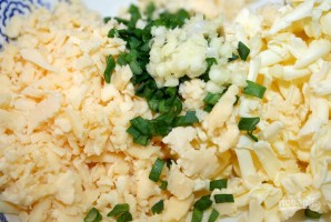 Холодное сливочное масло трем на терке. Также трем твердый сыр. Зелень измельчаем, а чеснок пропускаем через пресс.