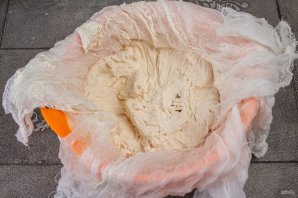 Дуршлаг выстелите несколькими слоями марли. Достаньте замороженный пакет ряженки из морозильника, разрежьте упаковку, достаньте замороженную ряженку и переложите в сито, застеленным марлей. Поставьте сито с ряженкой в миску, накройте марлей или пищевой пленкой и отправьте в холодильник на сутки. В процессе разморозки, можно помешивать ряженку лопаткой. Из ряженки стечет сыворотка в миску, а в сите останется нежный крем.