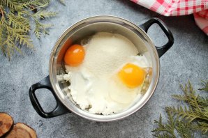 Переложите творожок в чашу, всыпьте манку и разбейте яйца. Все хорошо перемешайте.