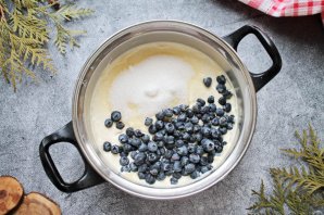 Добавьте ягоды и сахар, все перемешайте и дайте постоять 15 минут, чтобы манка набухла.