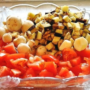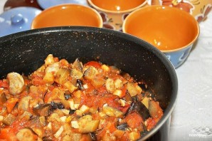 Первым делом нарежем произвольными кусками все наши овощи и грибы. Я обычно баклажаны и помидоры режу крупными кубиками, шампиньоны - где-то на четвертинки, чеснок - мелко. При желании можно добавить и другие любимые овощи.