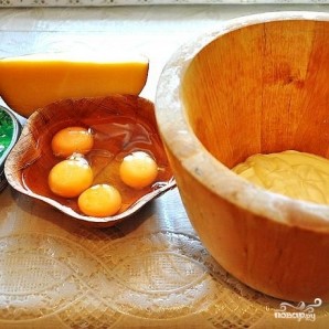 Яйца слегка взбиваем, твердый сыр натираем на терке. Смешиваем яйца, твердый и мягкий сыр, сметану и специи. Я добавил еще немного рубленой зелени.