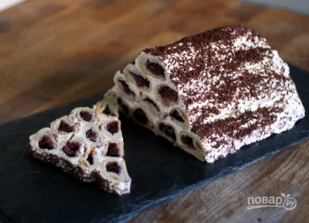Рецепт не отнимет много времени. Хорошо промыть курагу и чернослив и замочить их в горячей воде на полчаса, потом обсушить на полотенце. Размягченное масло растереть с сахаром. Добавить сметану и соль - перемешать. Муку смешать с разрыхлителем и постепенно ввести муку в масляно-сметанную смесь. Замесить мягкое тесто. Разделить его на 16 равных частей. Каждую из 15 частей раскатать толстым жгутиком длиной 20 см. Жгутик раскатать до ширины 7 см. По центру выложить чернослив или курагу. Закрепить края так, чтобы сухофрукты оказались внутри. Оставшуюся, 16-ую часть теста раскатать в прямоугольник длиной, равной длине трубочек, и шириной, равной ширине 5-ти выпеченных трубочек - это будет основание торта. Уложить "поленья" и основу на застеленный пергаментной бумагой противень, "поленья" - швом вниз. Выпекать до румяной корочки. В это время приготовим крем. Для этого мягкое сливочное масло взбиваем со сгущенкой (можно делать с вареную или обыкновенной). Когда тесто запеклось, даем заготовкам остыть, после чего собираем торт. Основание торта перекладываем на блюдо и смазываем тонким слоем крема. Сверху плотно, один к одному, укладываем 5 трубочек. Смазать их кремом, сверху выложить 4 трубочки. Снова полить кремом и положить 3 трубочки. Затем снова крем и 2 трубочки. И, наконец, крем и одну трубочку. Бока и верх торта смазываем оставшимся кремом и обсыпаем шоколадной стружкой или украшаем шоколадным топингом (или сиропом). Готовый торт убираем на несколько часов в холодильник, чтобы он пропитался Выпечка готова. Подавайте к столу.