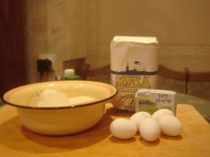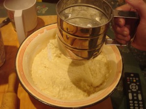 Всыпаем постепенно килограмм муки, замешиваем, тесто должно спокойно отлипать от рук.