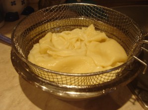 Достаем тесто дуршлагом, промываем холодной водой, даем стечь.