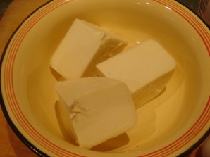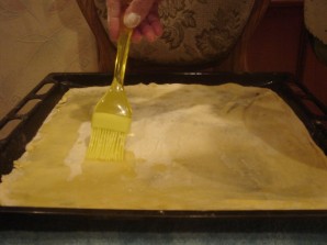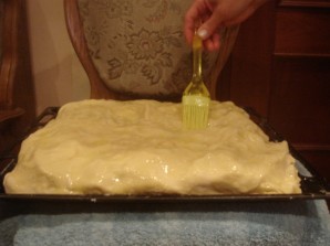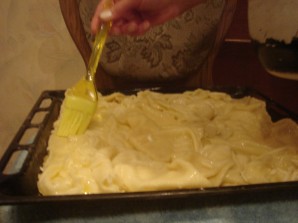 Выкладываем тесто сверху слоя сыра. Смазываем маслом.