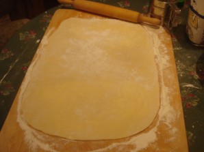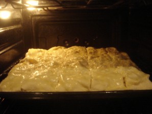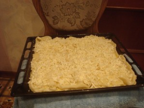 Потом опять сыр и сверху тесто. Так чередуем, пока не останется один слой теста для верха.