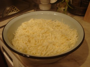 Поставьте греться воду в самой большой кастрюле, которую дома найдете. Воду подсолите. Тем временем трем сыр на крупной терке. Сулугуни - идеальный вариант (соленый, но в меру).