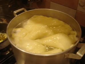Все остальные части теста тоже раскатываем и отвариваем в кипящей воде (помните, Вы кастрюлю греться ставили))Варим, пока не всплывут, варить нужно отдельно.
