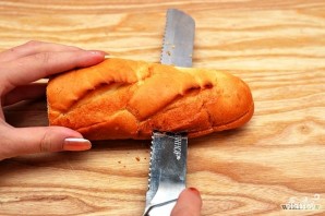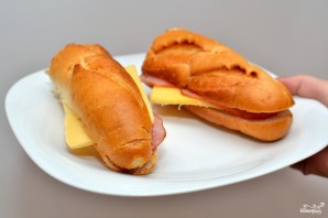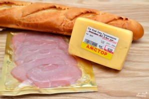 Сложите на нижнюю половинку багета ветчину и сыр. Накройте. Вот у вас и получился багет с ветчиной и сыром.