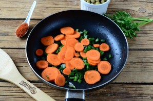 Одночасно на іншій сковороді обсмажте подрібнений зелений цибулю та нарізану кружочками моркву. Готуйте кілька хвилин.