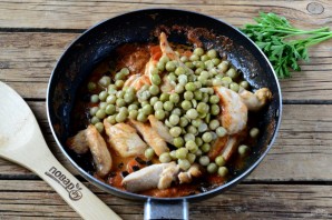 Потім додайте в сковороду консервований горошок. Перемішайте та готуйте кілька хвилин.