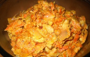 Засипаємо м'ясо і готуємо ще 10 хвилин, перемішуючи.