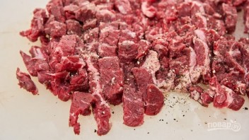 1. Вимийте м'ясо, обсушіть рушниками, наріжте невеликими шматочками та посипте сіллю, поперчіть з усіх боків.