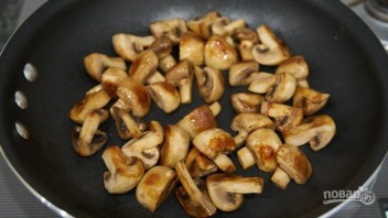 3. Поверніть сковороду на вогонь і покладіть вершкове масло, наріжте невеликі гриби на 4 частини і викладіть у сковороду, смажте до випаровування рідини.