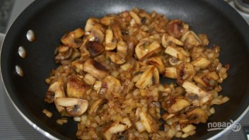 4. Дрібно наріжте цибулю і додайте її до грибів, перемішайте та смажте кілька хвилин.