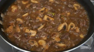 5. Влийте до грибів вино, добре поскребіть по дну й посиліть вогонь, готуйте до випаровування вина, додайте м'ясо, вилийте соус «Вустерширський», яловичий бульйон, додайте лавровий лист.