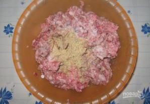 Фарш змішуємо з яйцем, сіллю та спеціями.