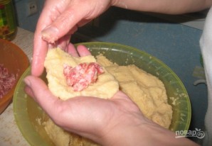 Розкочуємо з картопляного тіста лепешку та викладаємо в середину фарш. Формуємо пиріжки-колдуни.