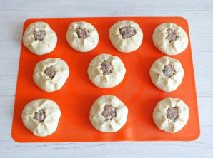 Возьмите одну часть, раскатайте в сочень толщиной 0,5 см. Выложите по 1,5 ст.л. без горки начинки. Начните защипывать по центру, оставляя открытым небольшое "окошко".