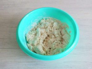 Перемешивайте сначала тесто ложкой, как только оно начнет собираться в комочки, месите руками. Тесто должно получиться мягким и податливым. Если оно слегка липнет к рукам, смажьте их маслом и еще раз вымесите тесто.
