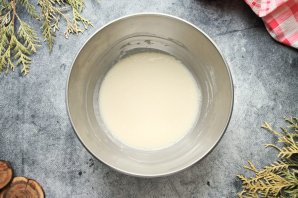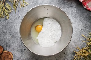 Добавьте в сыворотку соль, сахар, соду и разбейте яйцо. Всё хорошо перемешайте до однородности.