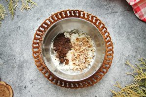 Добавьте в творог третий пряник и черемуховую муку, перемешайте.